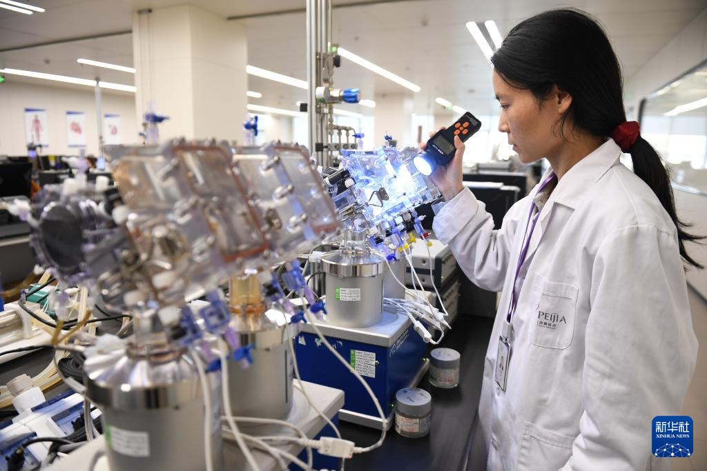 3月21日,在位于苏州工业园区的沛嘉医疗科技(苏州)有限公司测试实验室里,检测人员使用频闪仪检查正在疲劳测试中的人工心脏瓣膜开闭合形态。