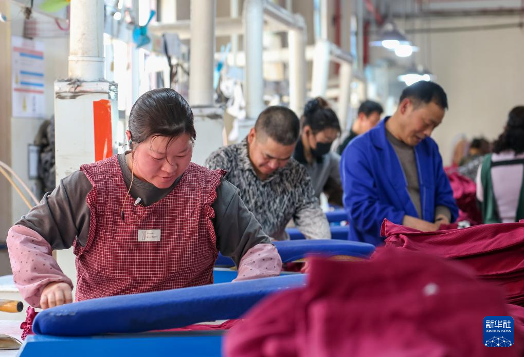 3月21日,工人在江苏句容经济开发区一家服装企业车间忙碌。