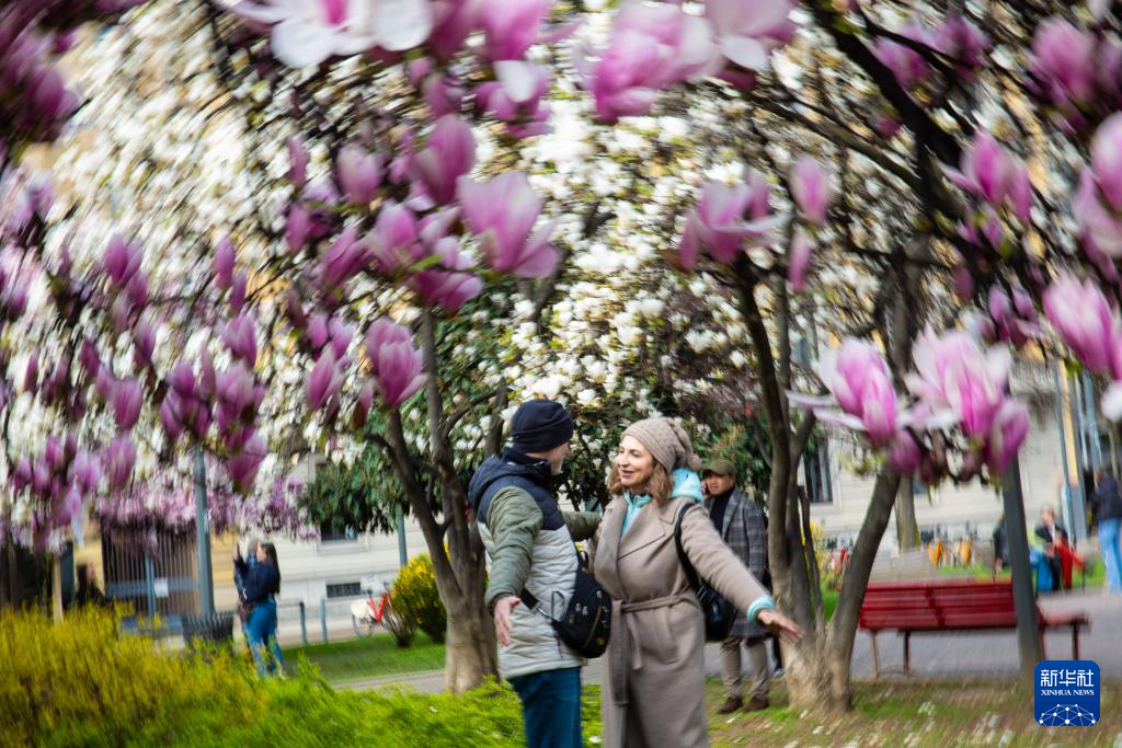 3月18日,在意大利米兰,人们在街心公园观赏玉兰花。