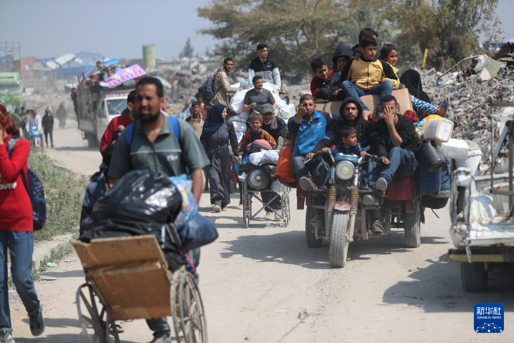 3月18日,被迫逃离加沙地带北部拜特哈嫩的巴勒斯坦民众经过加沙城。