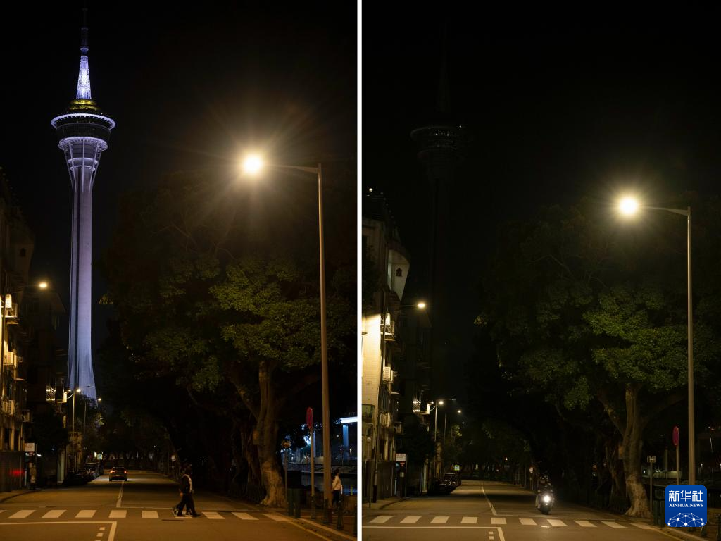 3月22日,澳门旅游塔熄灯前后的景象(拼版照片)。