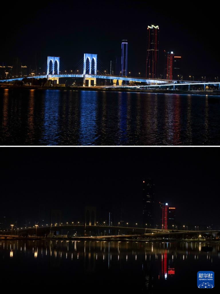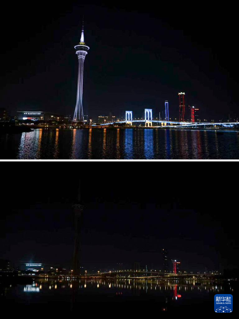 3月22日,澳门旅游塔、西湾大桥熄灯前后的景象(拼版照片)。