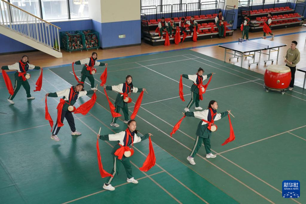 3月21日,在西安市曲江第六小学,学生在特色体育课上练习腰鼓。