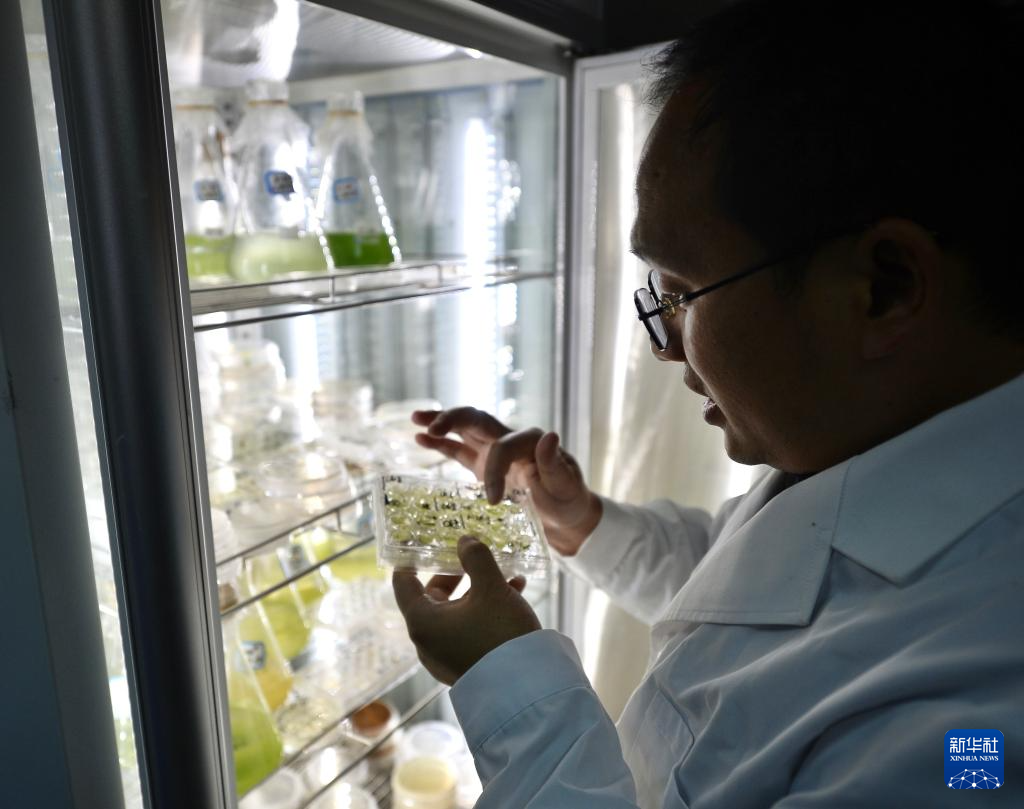 在中国科学院成都生物研究所实验室,谭周亮在检查重离子突变藻株选育结果(2021年12月6日摄)。