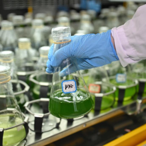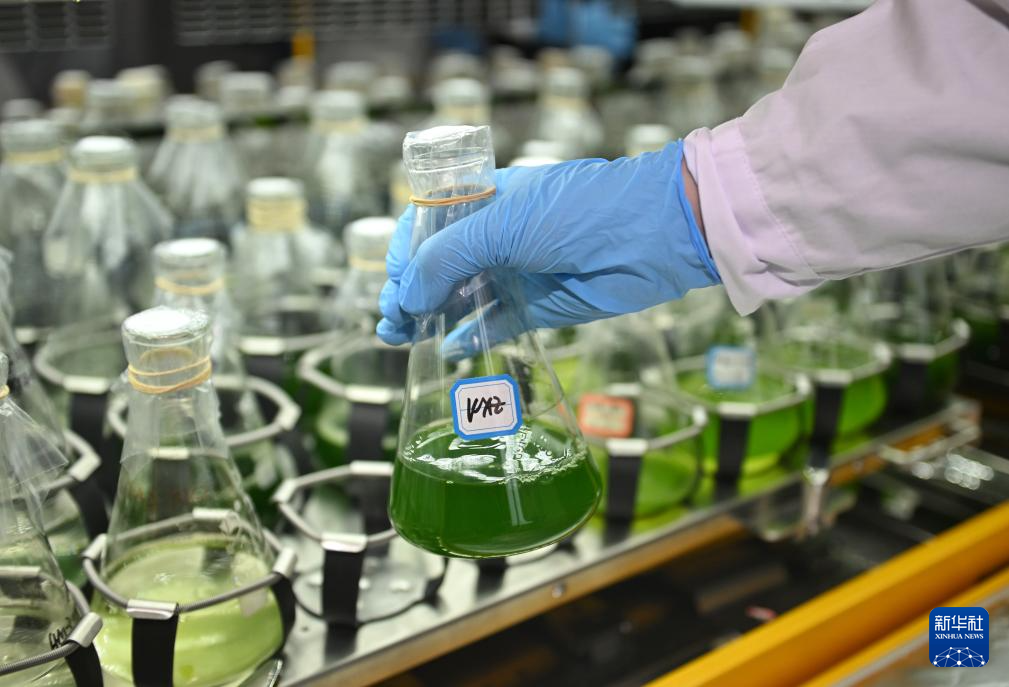 在中国科学院成都生物研究所实验室,合成微生物组与污水资源化创新团队科研人员在观察重离子突变藻株生长情况(2021年12月6日摄)。