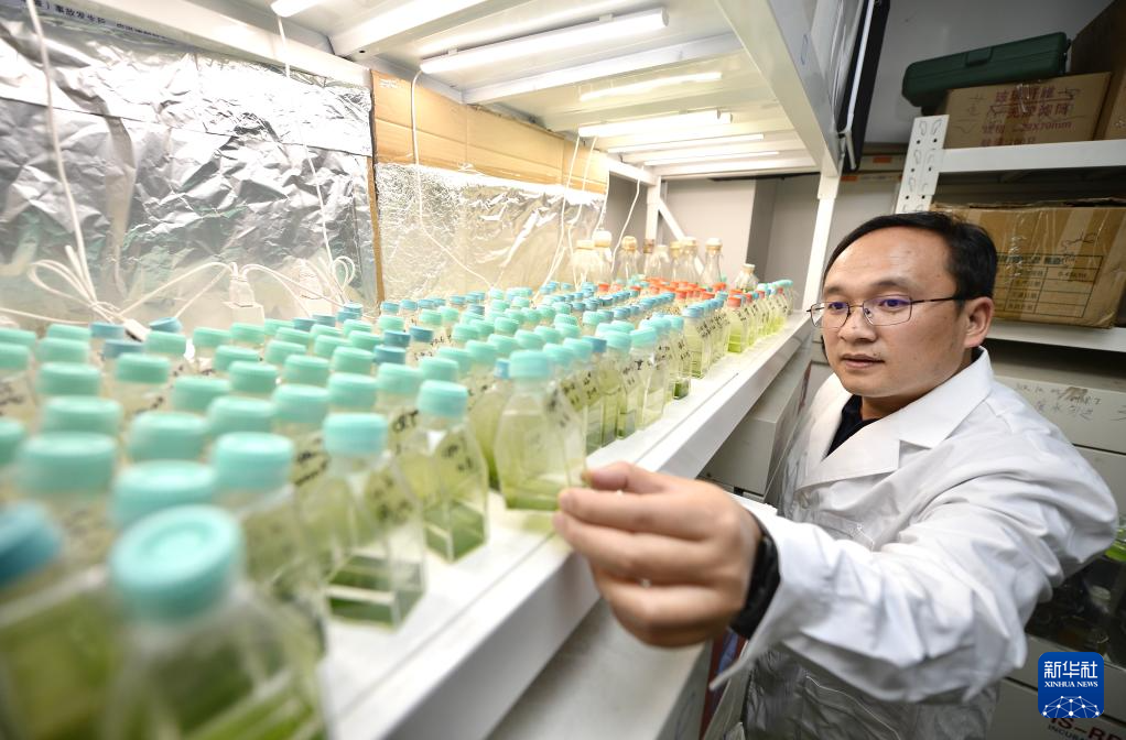 在中国科学院成都生物研究所实验室,谭周亮在查看藻类培养情况(2021年12月6日摄)。