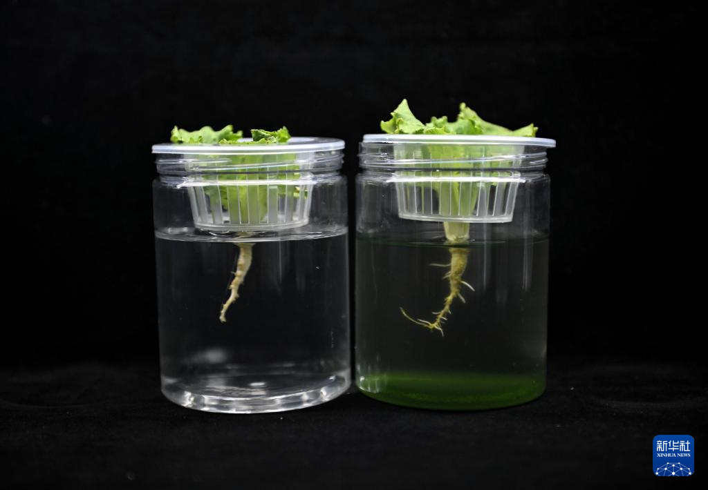 用藻液培养的蔬菜根系(右瓶)生长明显优于用清水培养的根系(3月20日摄)。