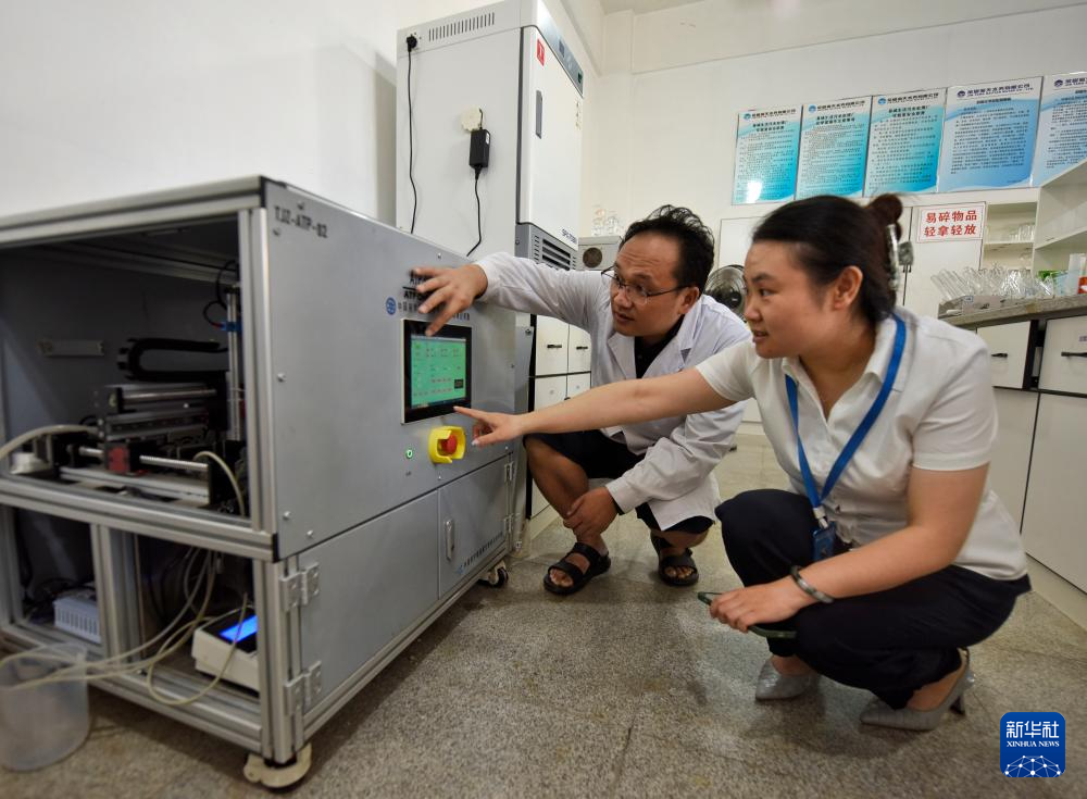 在成都金堂海天水务有限公司,谭周亮(左)向公司负责人了解其团队自主研发的微生物细胞活性检测设备在污水处理中的使用情况(2022年8月23日摄)。