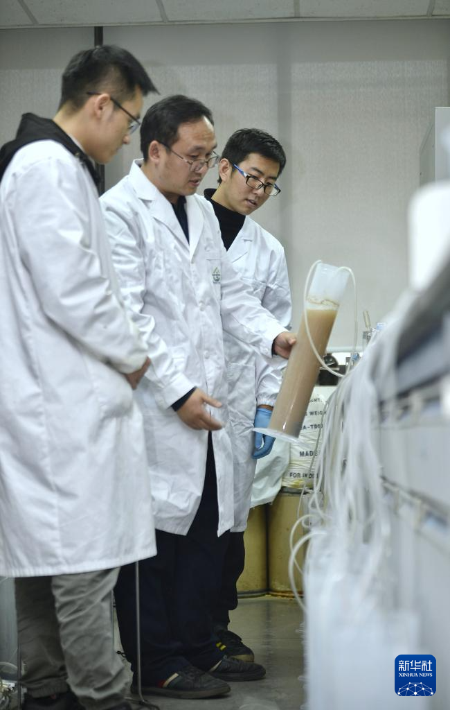 3月18日,在成都市大邑县污水处理厂,合成微生物组与污水资源化创新团队科研人员在为实验收集样本。