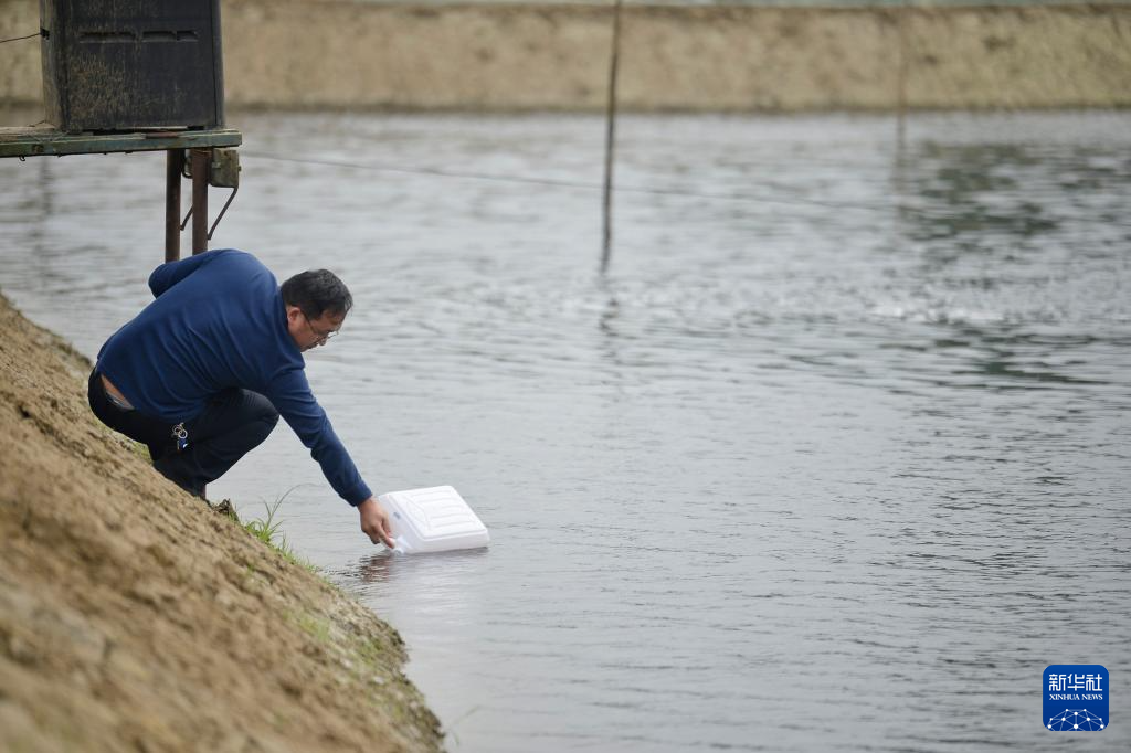 在四川省眉山市彭山区,谭周亮在一处水产养殖池塘中提取水样(2022年4月13日摄)。