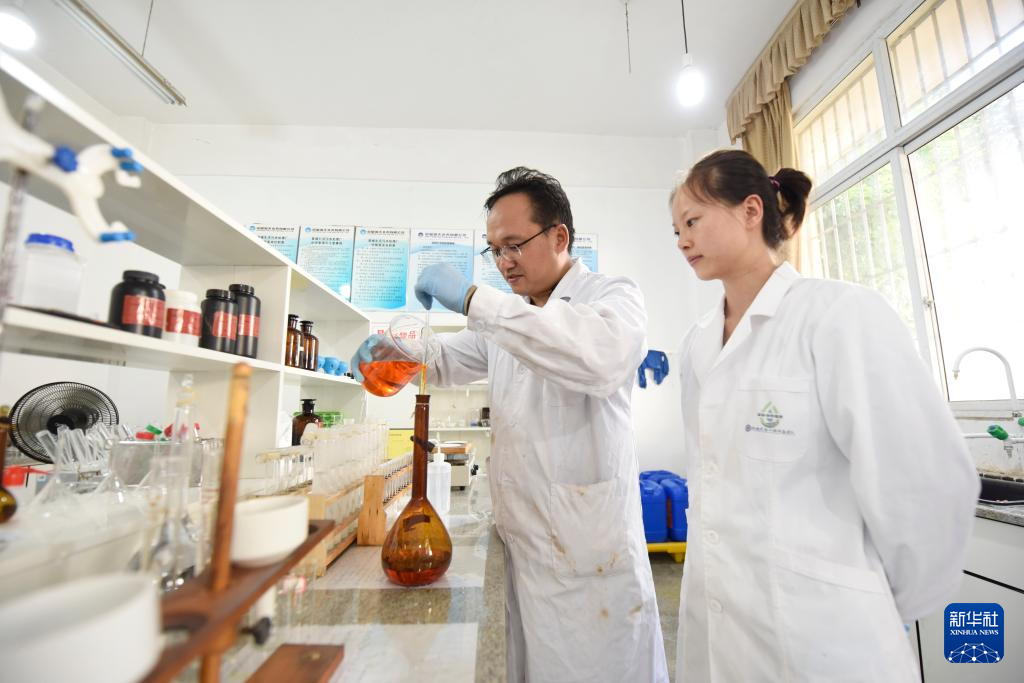 在成都金堂海天水务有限公司,谭周亮(左)在现场指导学生进行实验(2022年8月23日摄)。