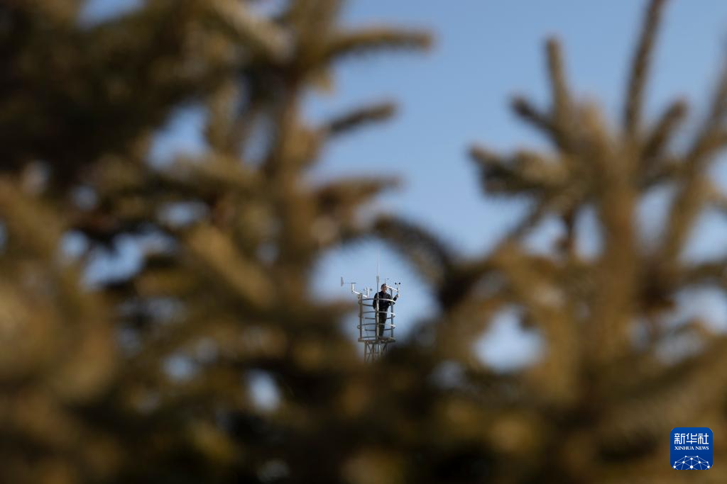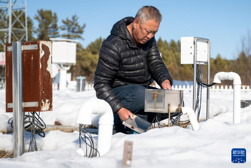3月22日,在北极村国家基本气象站,气象测报员郭大勇在巡检设备。
