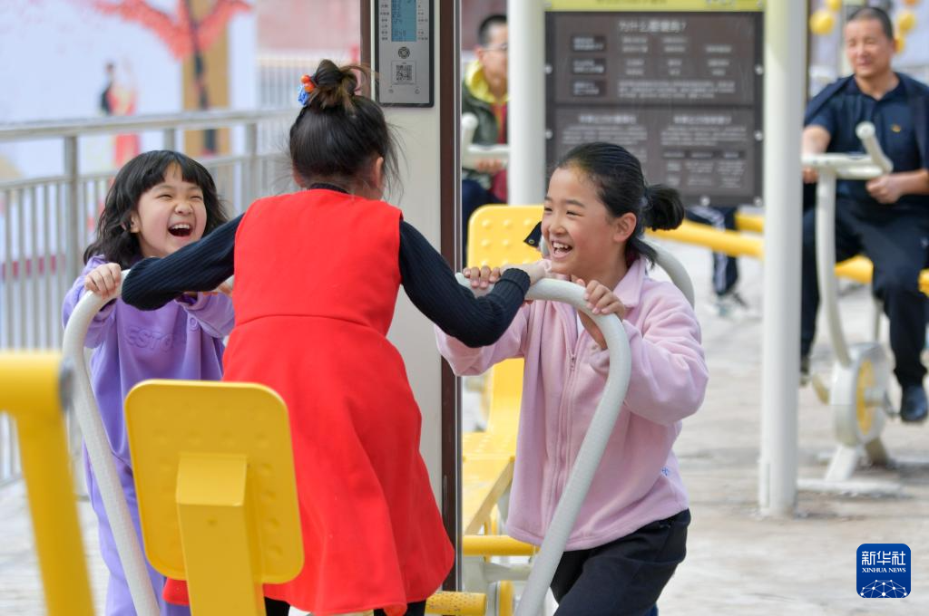 在乌鲁木齐市水磨沟区苇湖梁片区立井南社区居委会院中,小朋友在运动设施上锻炼身体(3月22日摄)。
