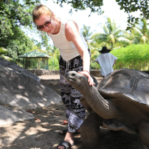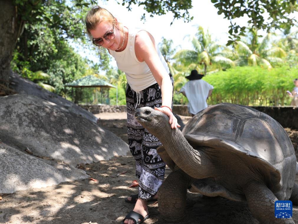 3月15日,在塞舌尔拉迪格岛,一名游客与塞舌尔巨龟合影。