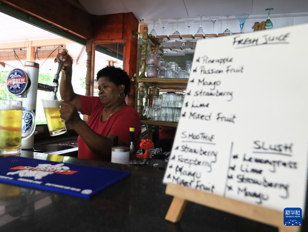 3月15日,在塞舌尔拉迪格岛,一名餐厅服务员为游客准备塞舌尔产啤酒。