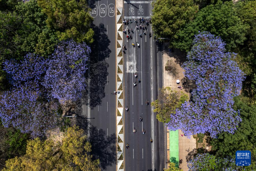 3月23日,在墨西哥首都墨西哥城,人们在改革大道盛开的蓝花楹下骑车(无人机照片)。