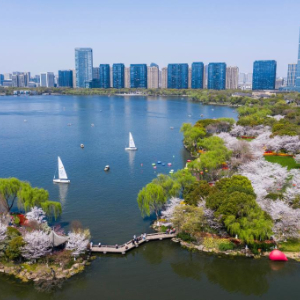 随着近期气温升高,浙江省绍兴市柯桥区瓜渚湖畔的樱花和郁金香大面积盛开,吸引游客前来赏花踏青。