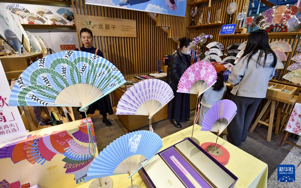 3月25日,游客在前门大街京扇子店内选购扇子。