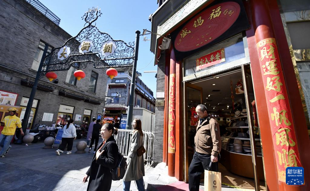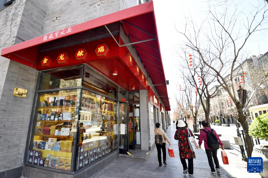 3月25日,游客从前门大街的盛锡福帽子店走出。