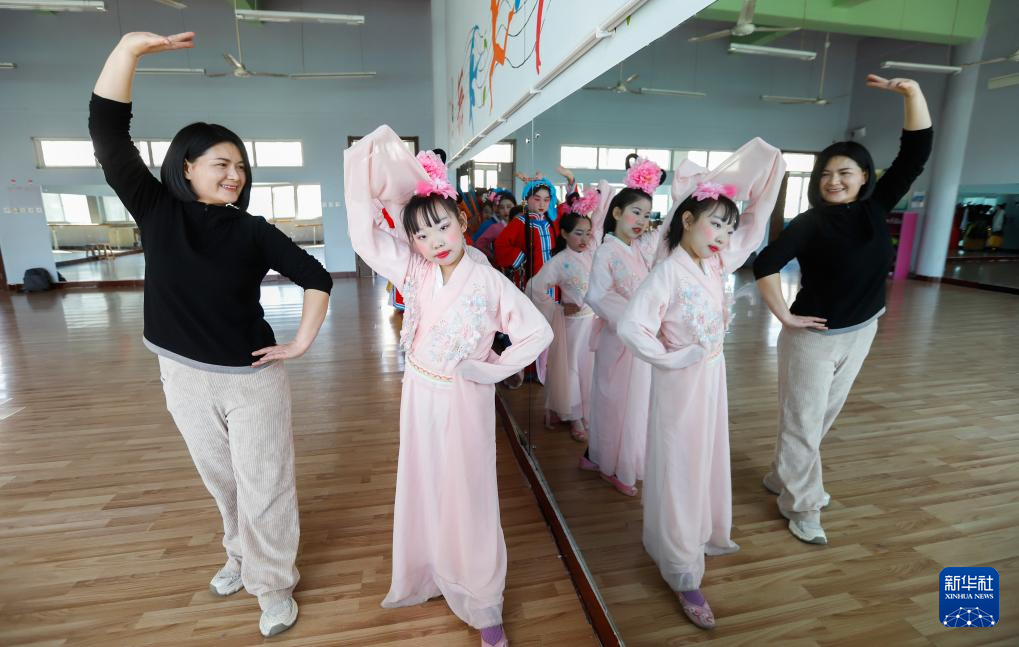 3月25日,在河北省唐山市丰润区泉河头镇团山子小学,评剧演员在教学生戏曲动作。