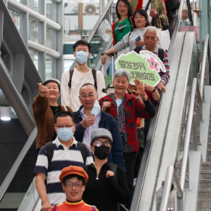 3月26日,游客和穿着“老寿星”服饰的工作人员在银发旅游列车上合影。