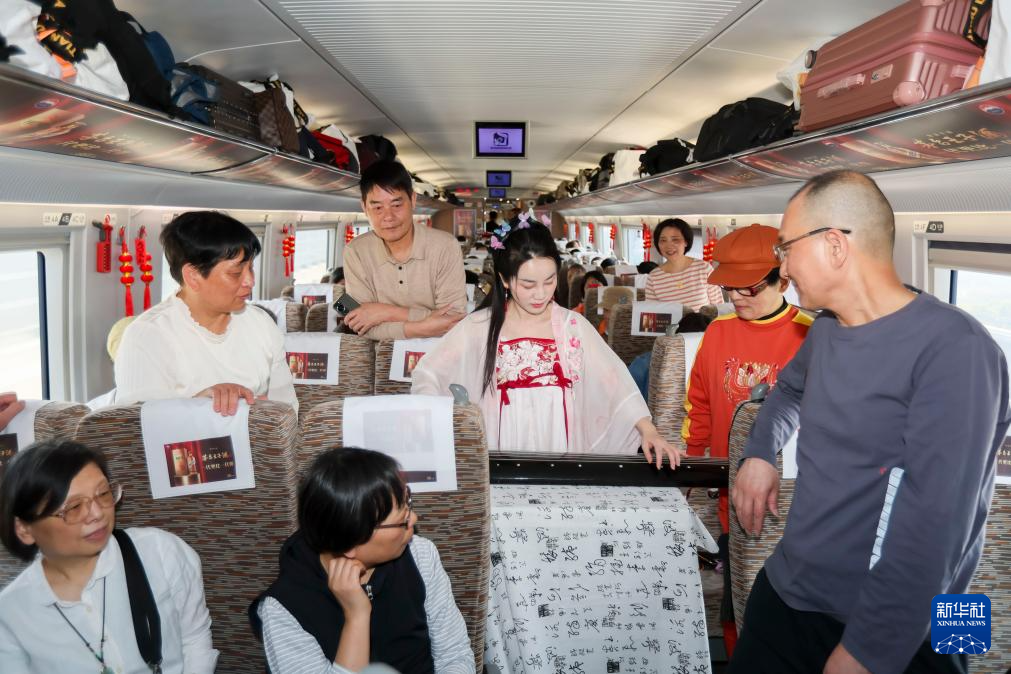 3月26日,游客在银发旅游列车上欣赏古琴表演。