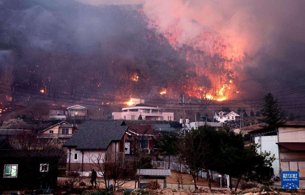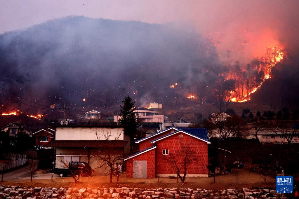 3月25日晚,山火蔓延至韩国庆尚北道安东的村庄。