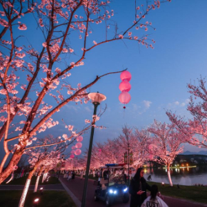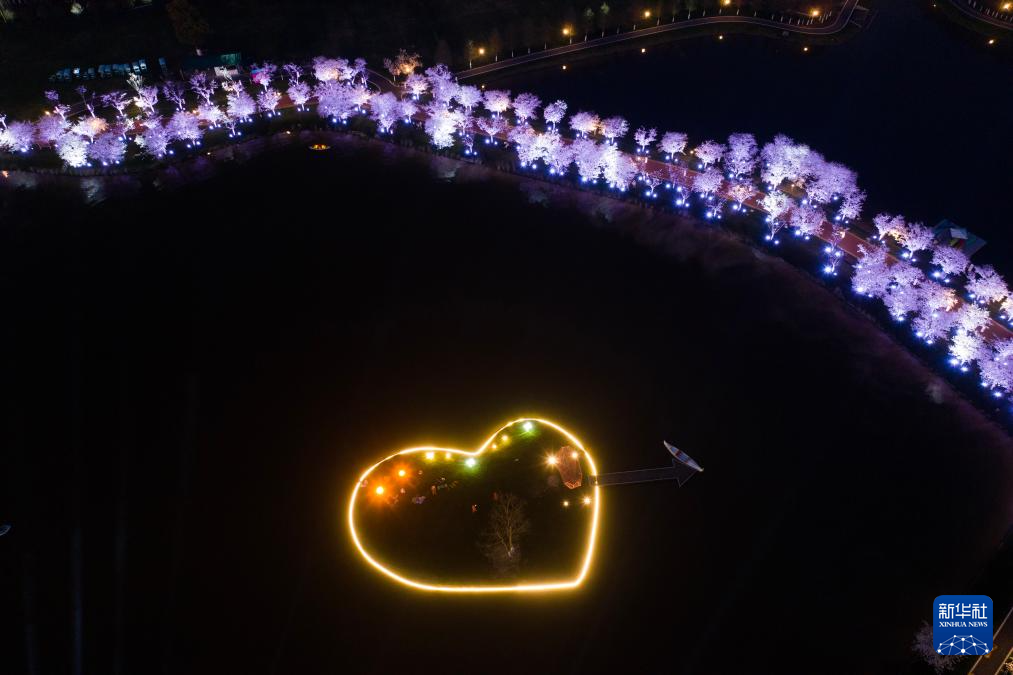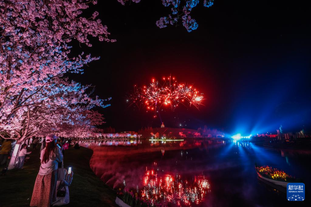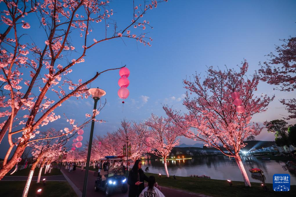 3月25日,游客在花田美地景区观赏夜色中的樱花林。
