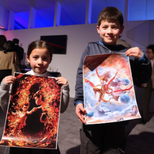 3月26日,在比利时布鲁塞尔,小朋友在《哪吒之魔童闹海》首映活动上手持海报合影。