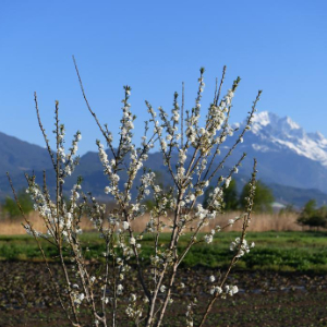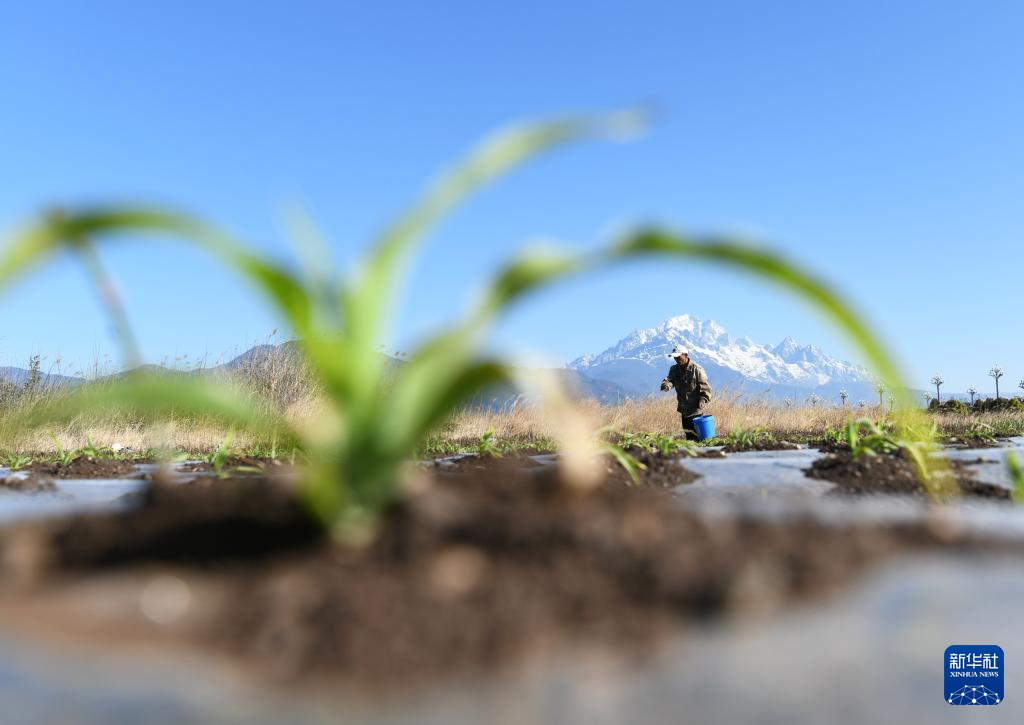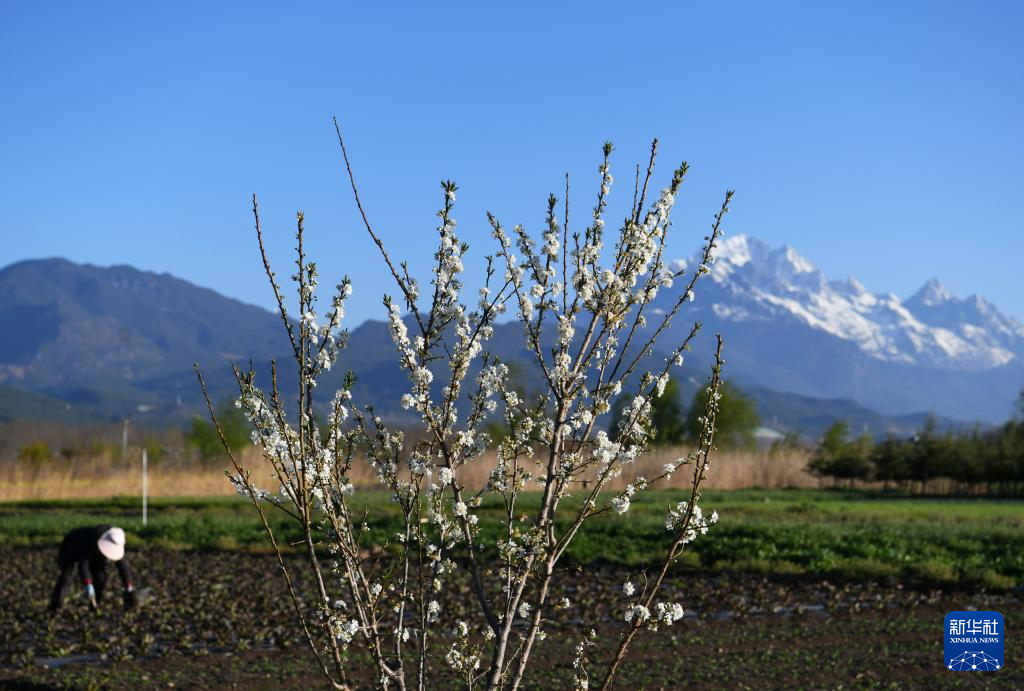春暖时节,云南省丽江市玉龙县春耕备耕工作正在进行,农民在雪山脚下的田野中忙碌。