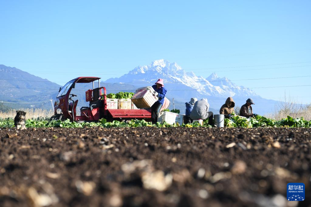 3月27日,云南省丽江市玉龙县黄山街道农民在地里采收搬运蔬菜。