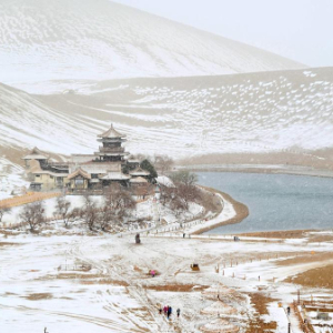 3月26日,甘肃省敦煌市迎来降雪,鸣沙山月牙泉景区银装素裹,景色如画。