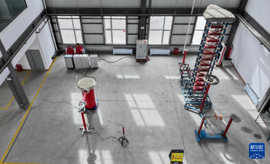 3月27日,在位于宁夏贺兰工业园区的汤姆森电气有限公司高压实验室内,工作人员进行复合材料横担的耐压测试(无人机照片)。