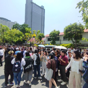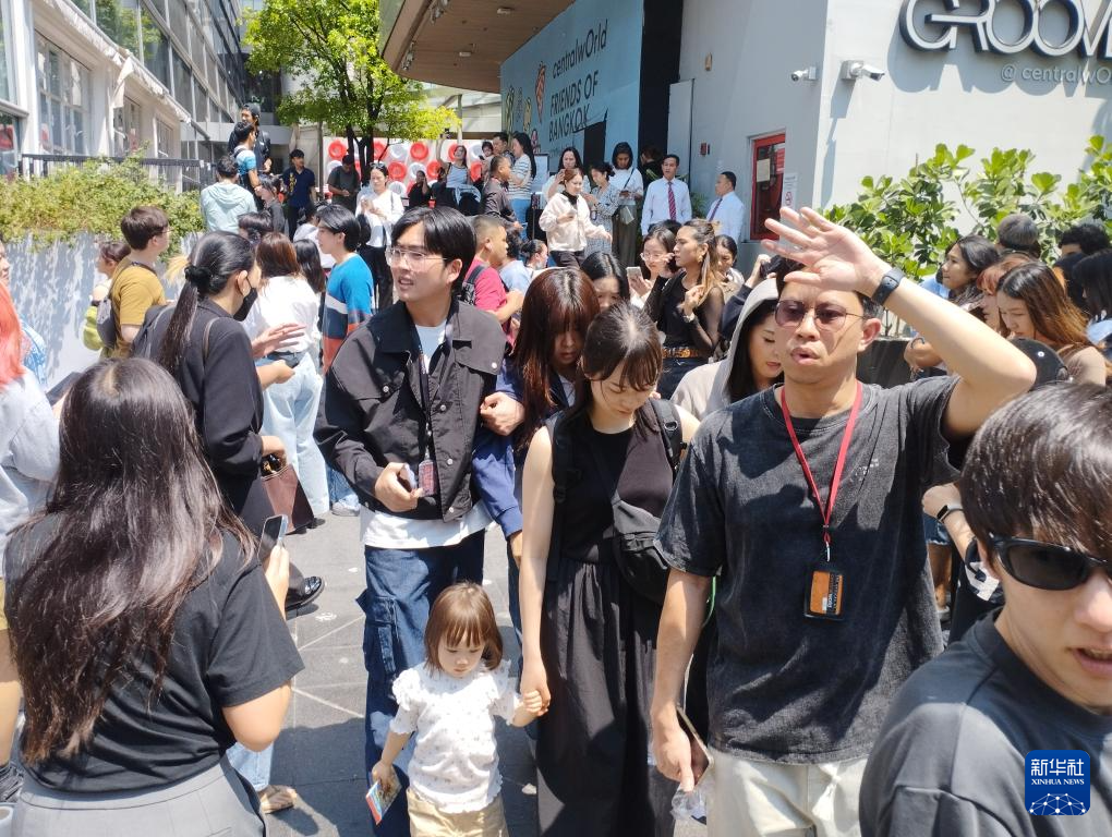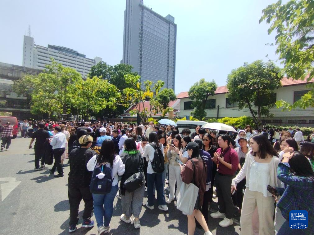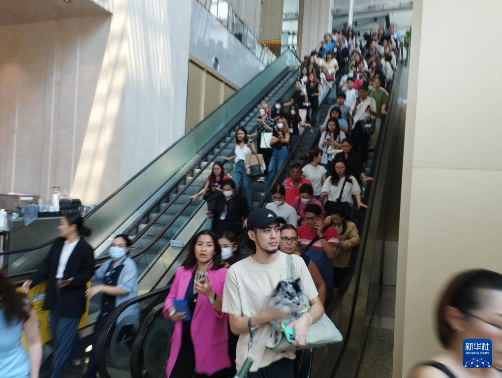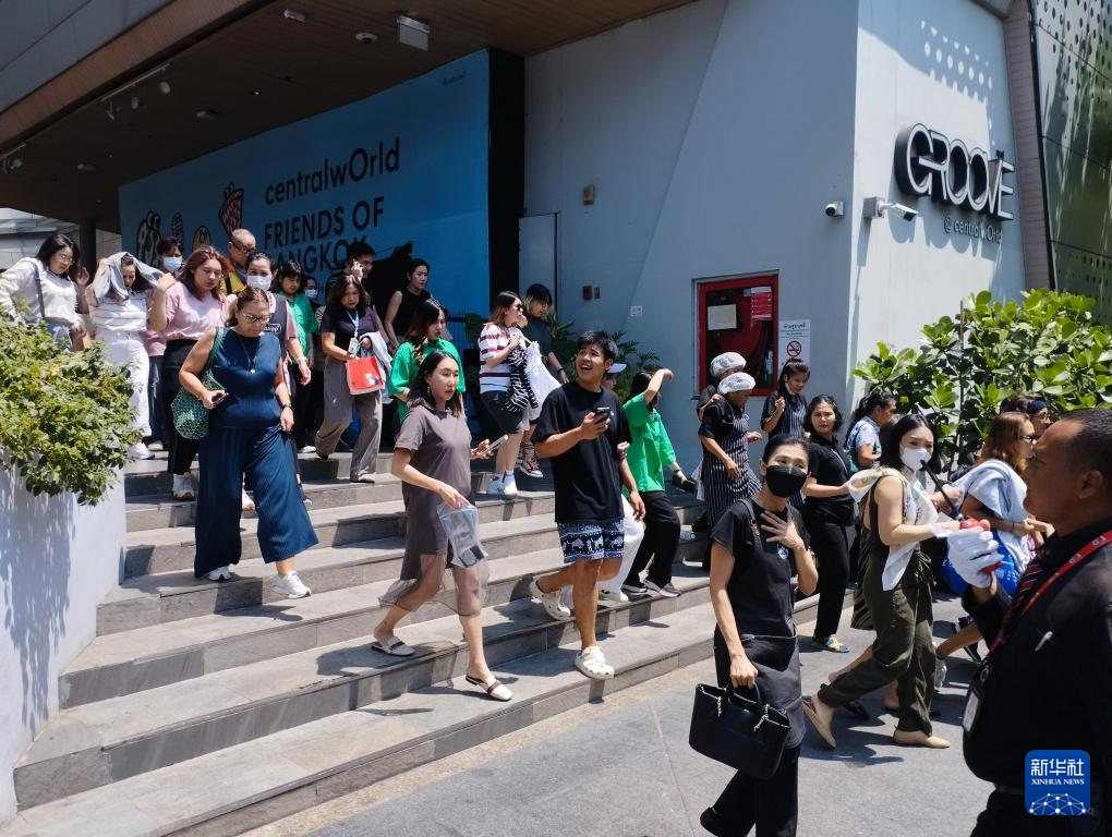 3月28日,在泰国曼谷,人们在地震发生后走出建筑避险。