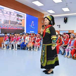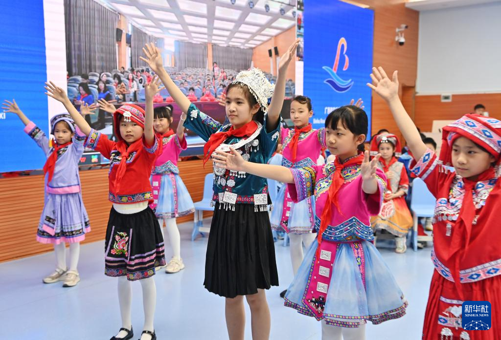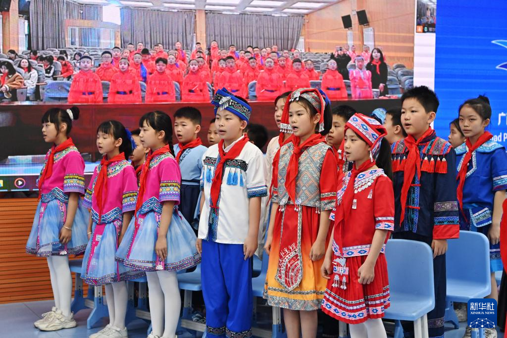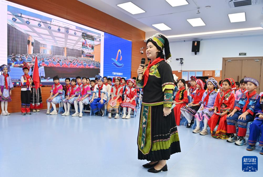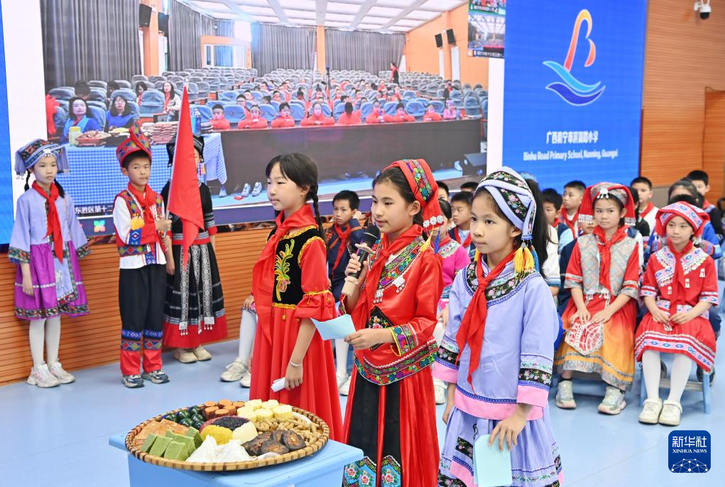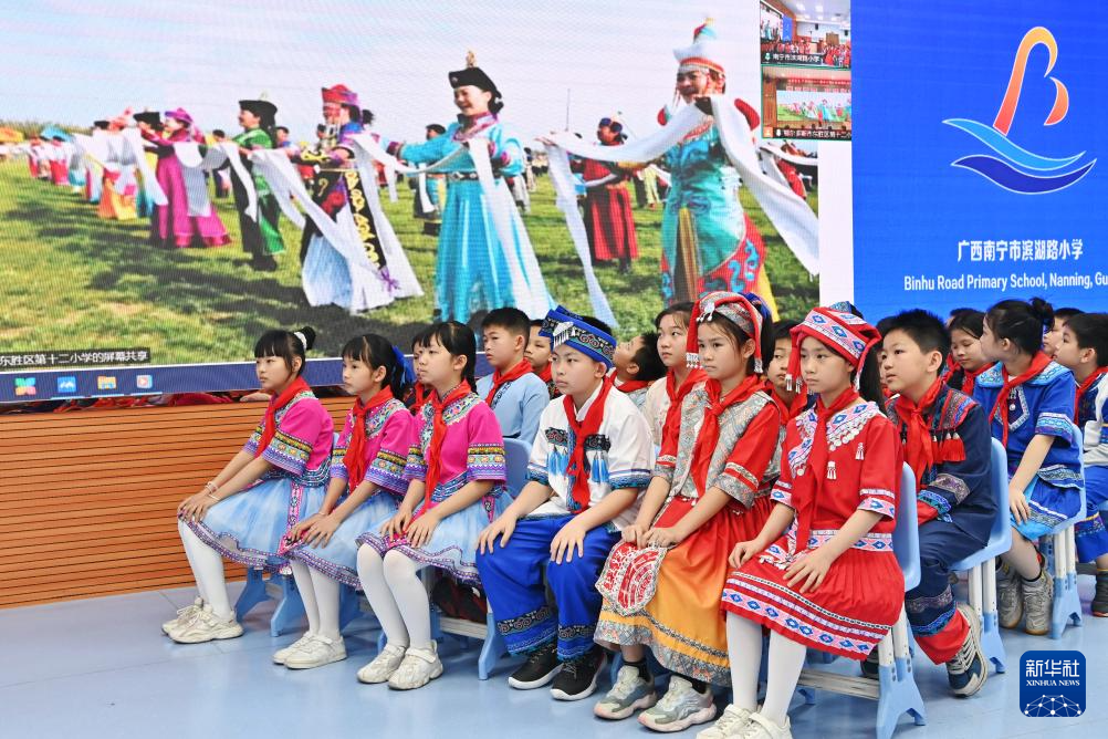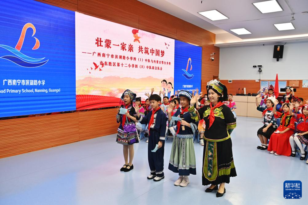 当日,广西南宁市滨湖路小学四(1)中队和内蒙古鄂尔多斯东胜区第十二小学四(9)中队举行“壮蒙一家亲 共筑中国梦”手拉手主题云队会。双方队员在辅导员老师的带领下,一起唱歌、相互介绍传统文化、展示传统美食,其乐融融。