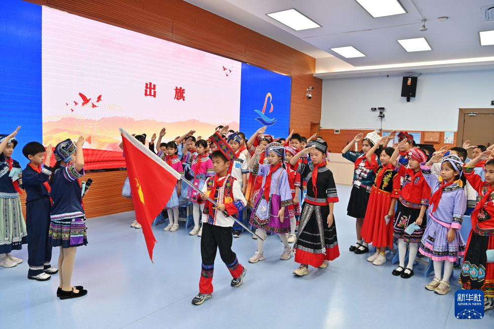 3月28日,广西南宁市滨湖路小学四(1)中队队员在举行出旗仪式。