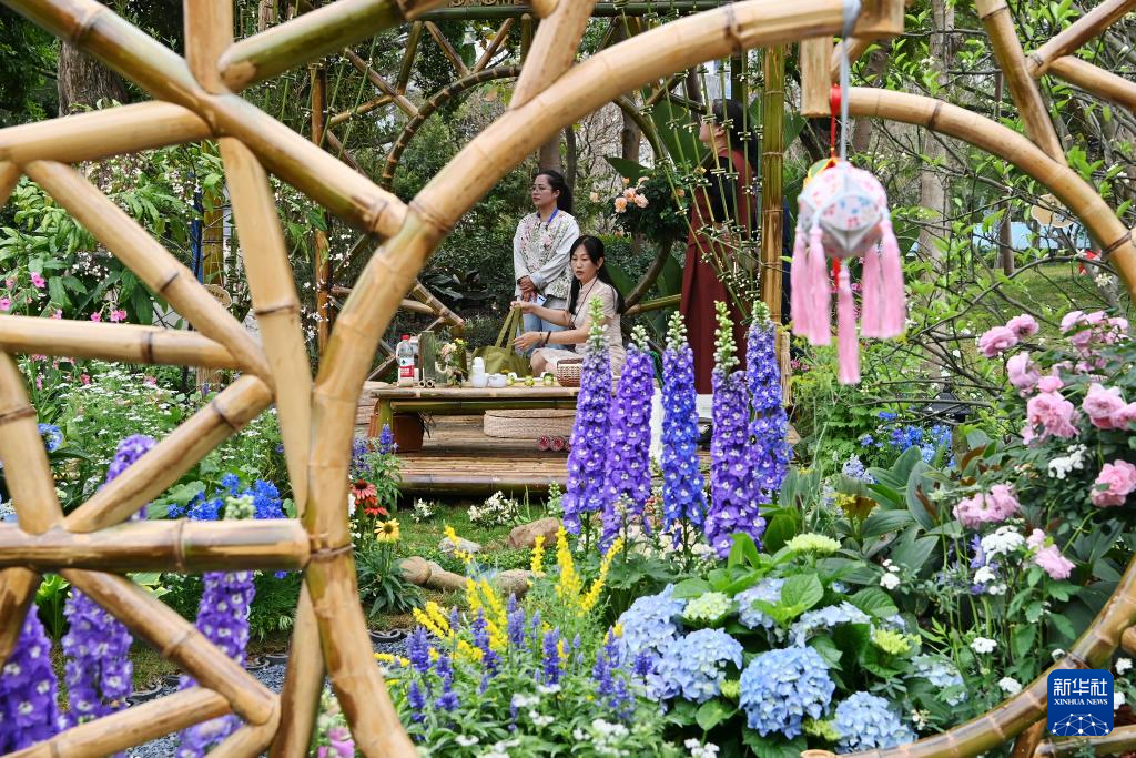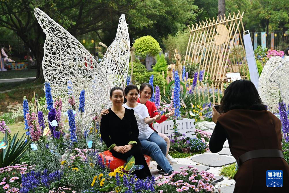 3月28日,观众在广西南宁市南湖公园体验花境作品。