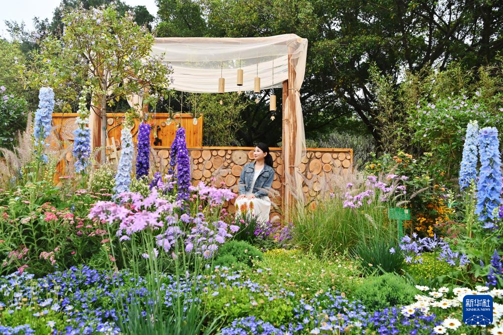 3月28日,观众在广西南宁市南湖公园花境作品里留影。