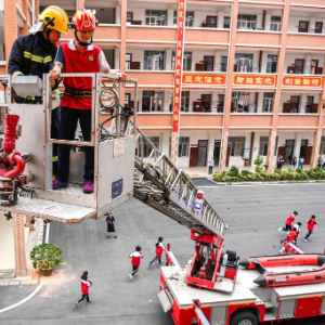 3月28日,在广西兴业县第一中学,消防员带领学生开展云梯逃生演练。
