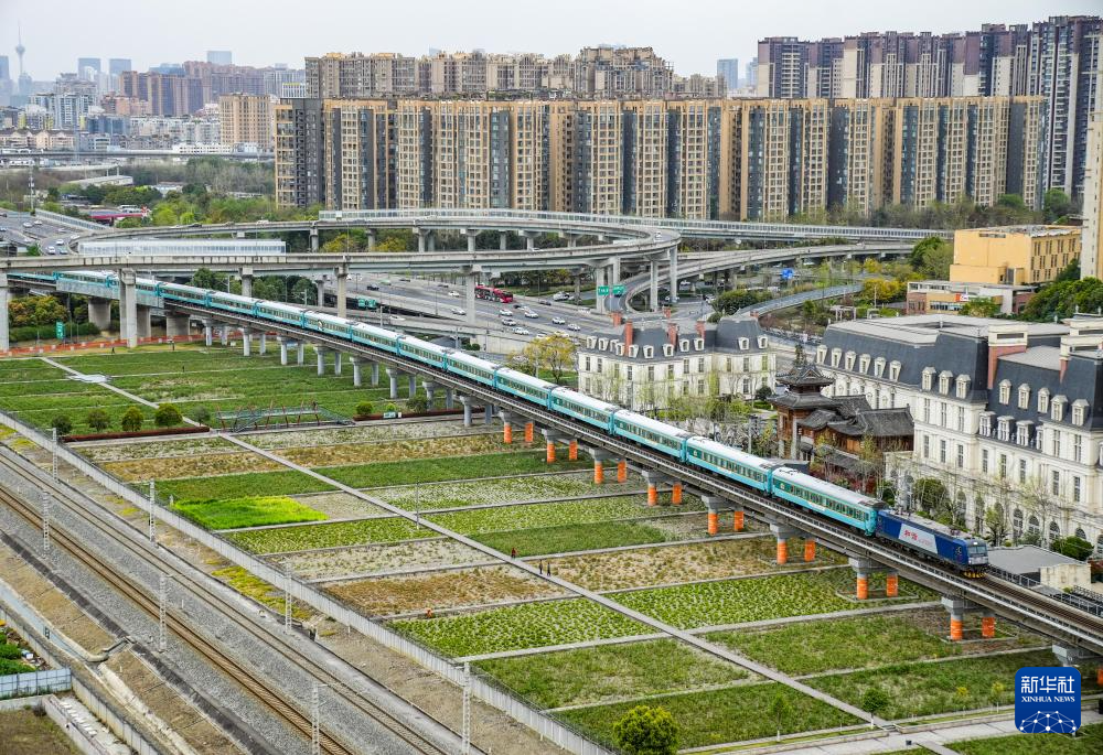3月28日,Y471次“熊猫专列·什邡号”列车行驶在四川省成都市境内的石羊立交桥上(无人机照片)。