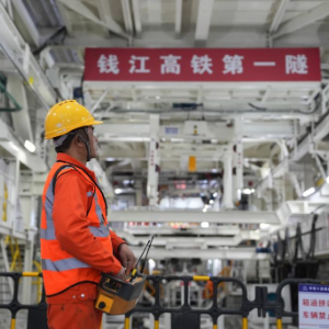 3月29日,中铁十四局技术人员在钱塘江隧道“钱塘号”盾构机内作业。