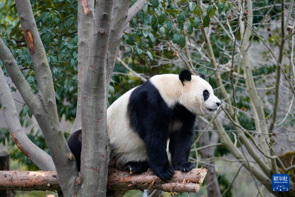 3月28日,在中国大熊猫保护研究中心卧龙神树坪基地,大熊猫“福宝”在树上玩耍。
