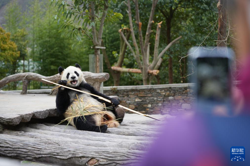 3月28日,在中国大熊猫保护研究中心卧龙神树坪基地,游客在拍摄大熊猫“玲琅”。