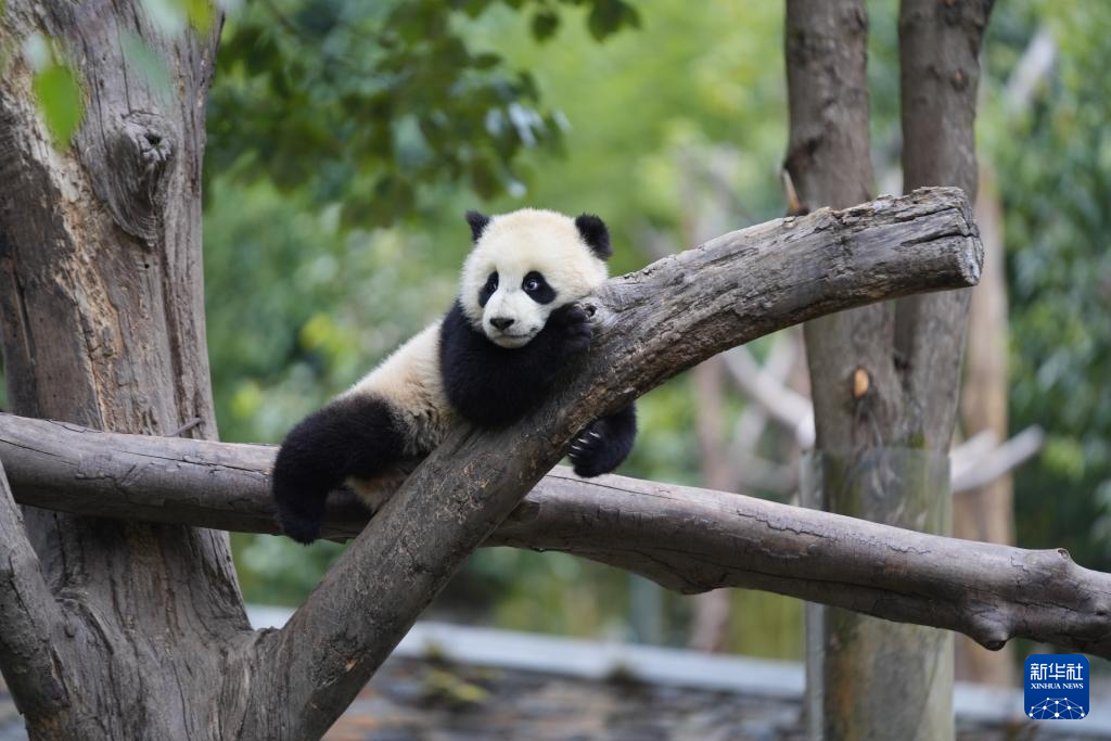 3月28日,在中国大熊猫保护研究中心卧龙神树坪基地,大熊猫幼崽在树上玩耍。