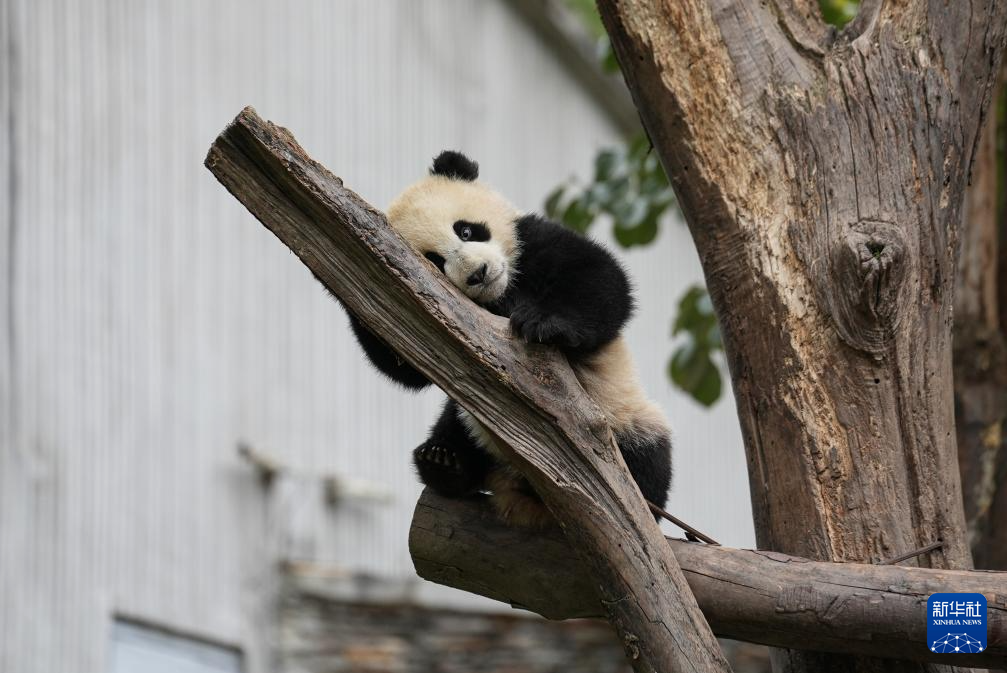 3月27日,在中国大熊猫保护研究中心卧龙神树坪基地,大熊猫幼崽在树上玩耍。