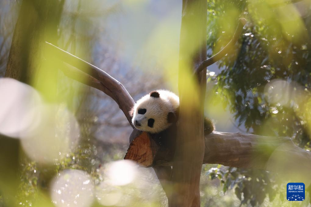 3月28日,在中国大熊猫保护研究中心卧龙神树坪基地,大熊猫幼崽在树上休憩。