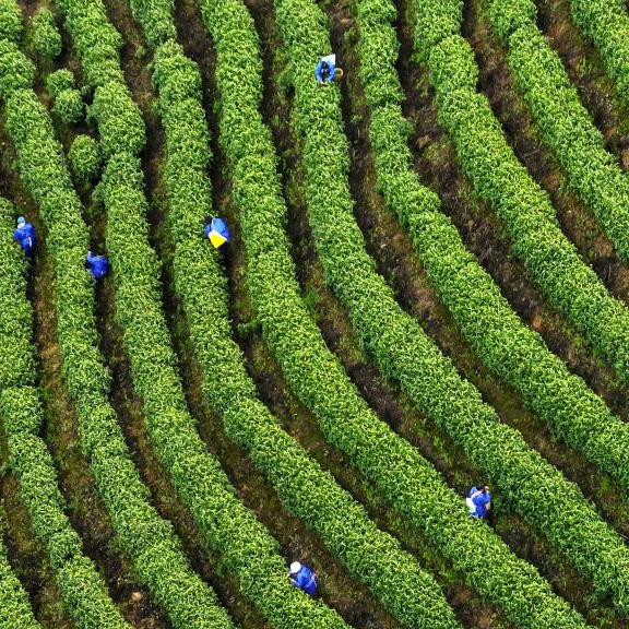 3月29日,在浙江省台州市仙居县横溪镇阳峰山生态茶场,茶农忙着采摘明前茶(无人机照片)。