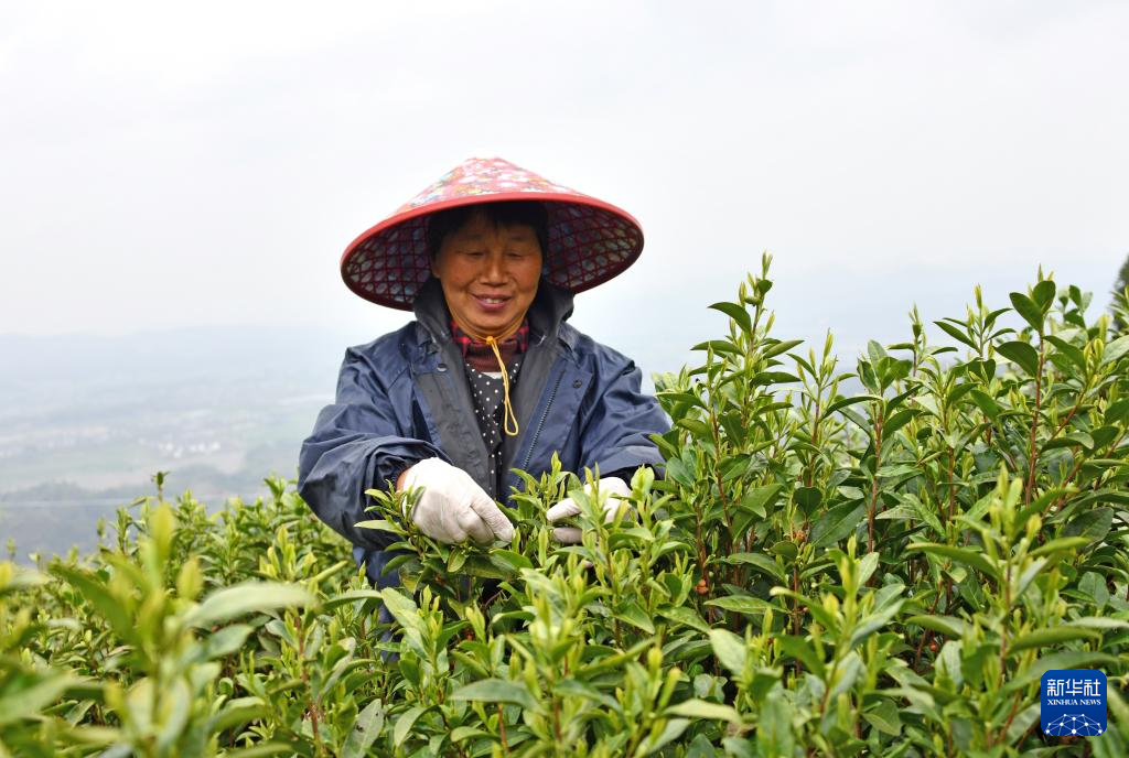 3月29日,四川省达州市通川区碑庙镇千口村茶农在采摘明前茶。
