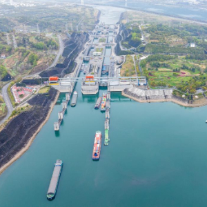 3月29日,在湖北宜昌,船舶有序通过三峡双线五级船闸(无人机照片)。