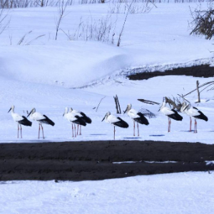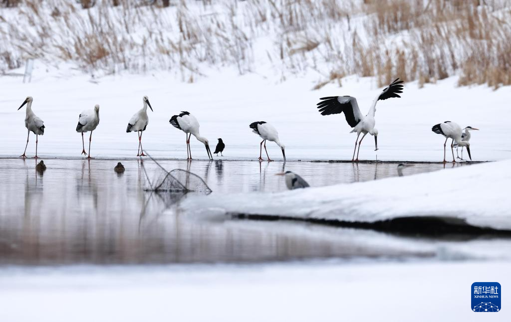 3月29日,在黑龙江省抚远市沿江公园湿地,一群东方白鹳在冰面上休息。